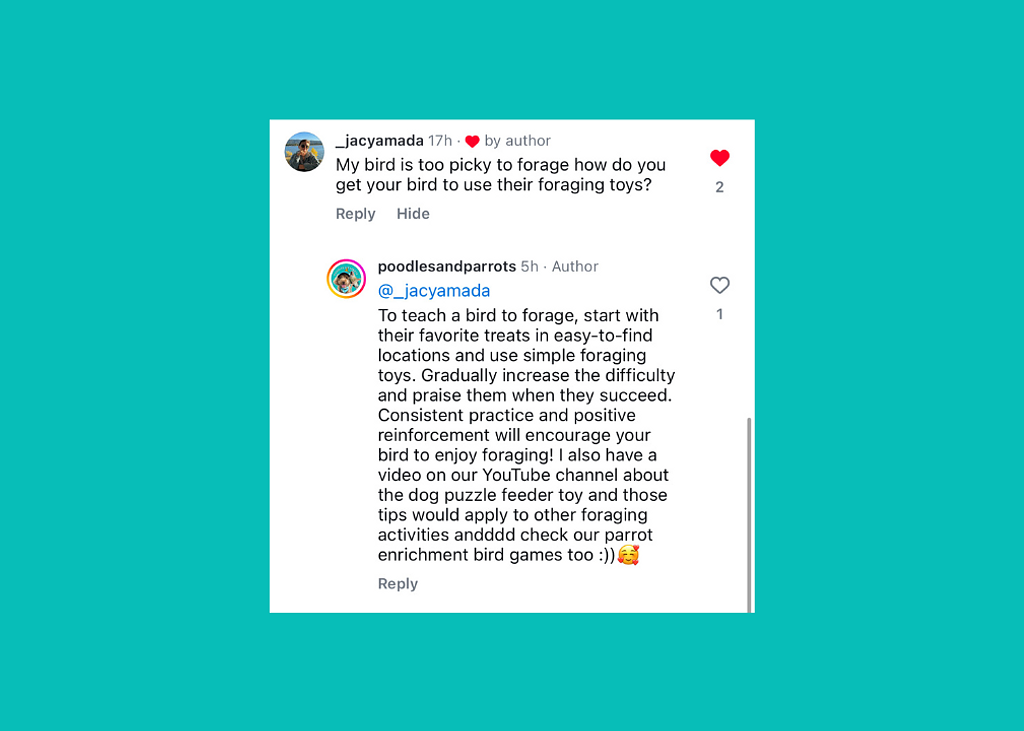 Birds learn by observation. Show them how to forage by gently tapping or moving the foraging toy or hidden food. They may mimic your actions and start foraging on their own.