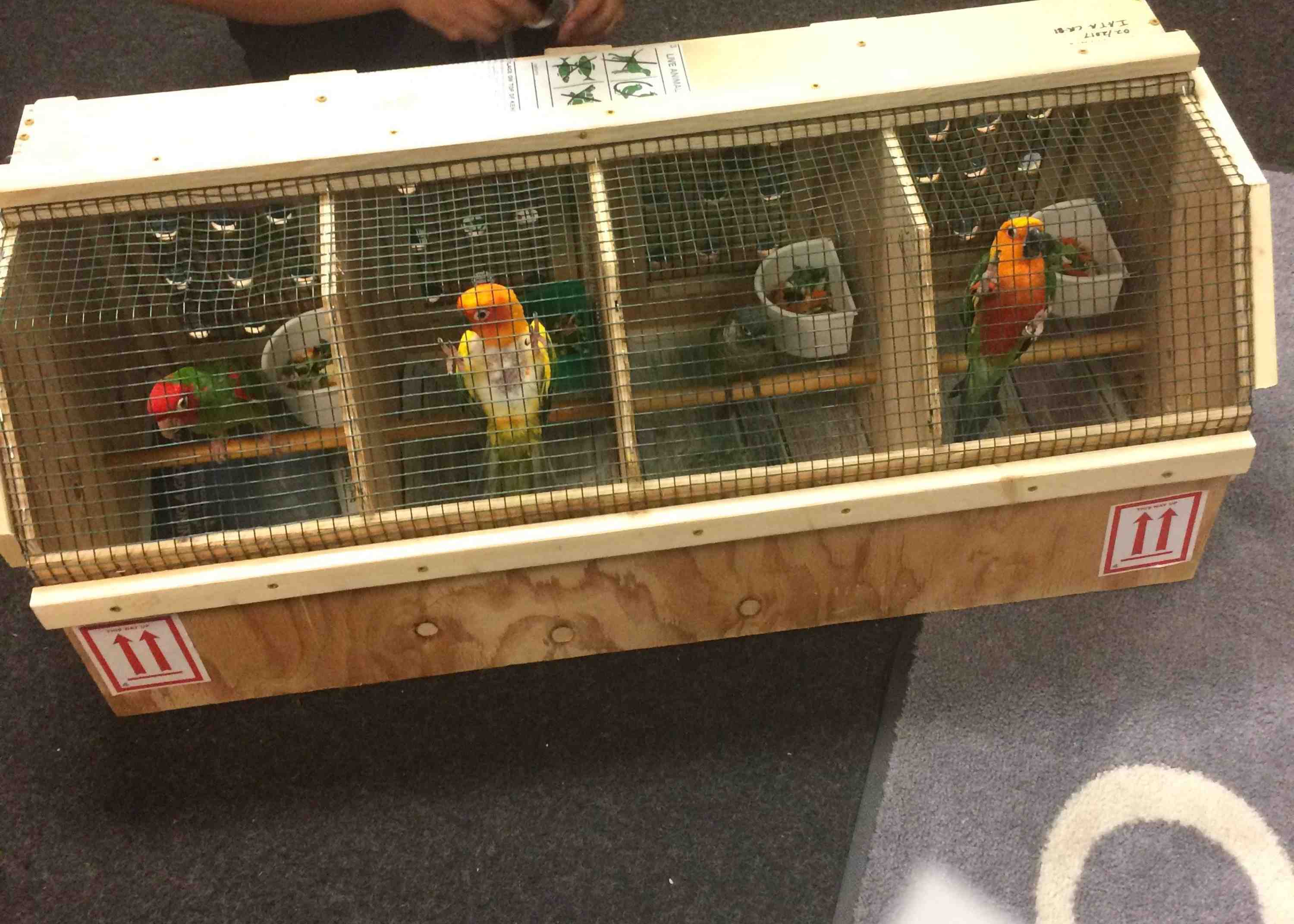 4. Prepare the crate: Have a food dish (you can also tape a bag of pellets on top of the crate as well in case you have a long flight), a water dish filled with ice, if possible a toy, line the bottom of the crate for droppings, and make sure they have a perch with enough room to move around. You can put a screen mesh over the door for added protection, write the measurement of the crate on top and their name, and use zip ties to seal each corner and door.