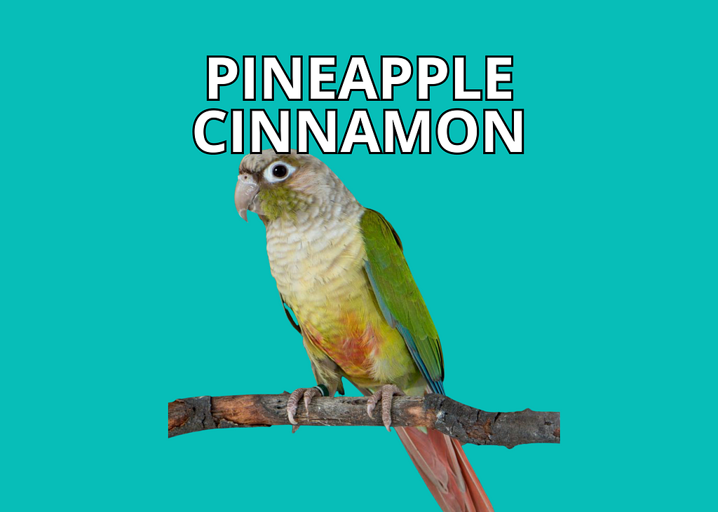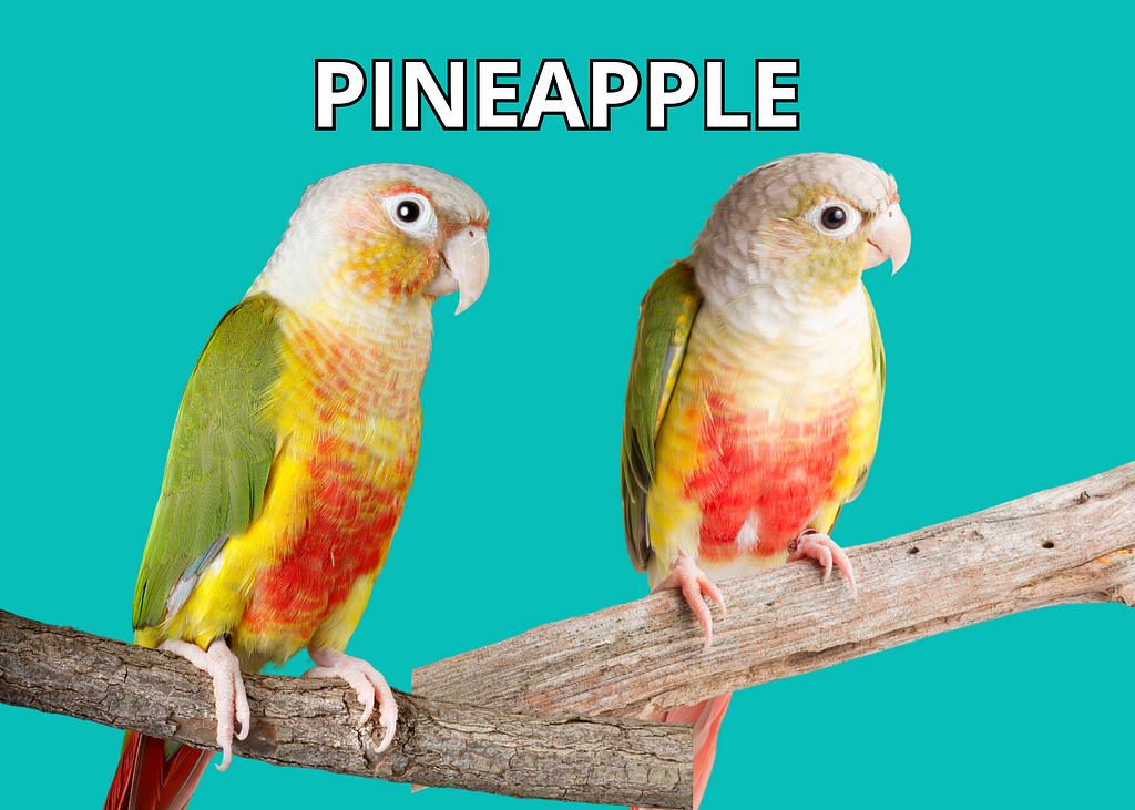 Pineapple green cheeks display a vibrant mix of yellow, orange/coral, and red colours on their body. The feathers on their back and wings are a warm green. They are sometimes bred with a cinnamon conure resulting in a pineapple cinnamon.