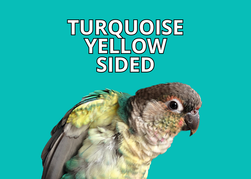 Turquoise green cheeks display a beautiful turquoise colour instead of green. This mutation affects the distribution of melanin in the feathers, resulting in this eye-catching blue-green hue. Mia is a mix of turquoise and yellow-sided, resulting in turquoise wings and a yellow peach belly.