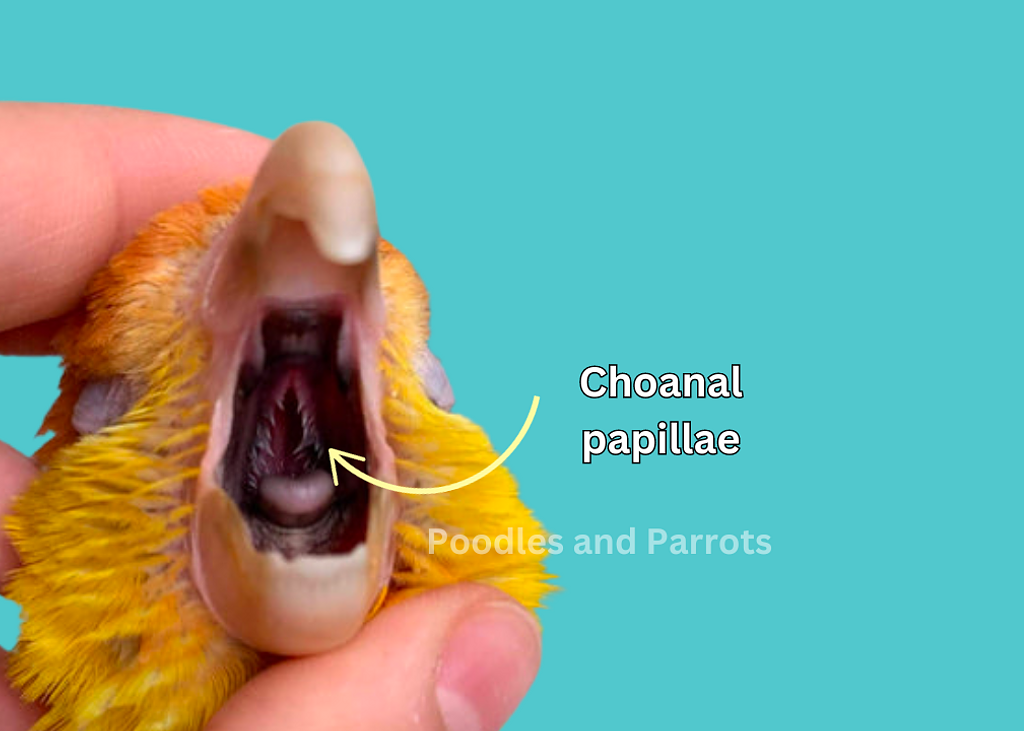 In terms of diet and health, the condition of the choanal papillae can provide valuable insights into a parrot's well-being. Healthy choanal papillae typically appear moist, smooth, and pinkish in colour. The choanal papillae are more likely to be in good condition if a parrot is on a well-balanced and nutritionally appropriate diet and sharp projections indicate proper vitamin A assimilation, whereas blunted projections indicate that there could be a vitamin A deficiency.