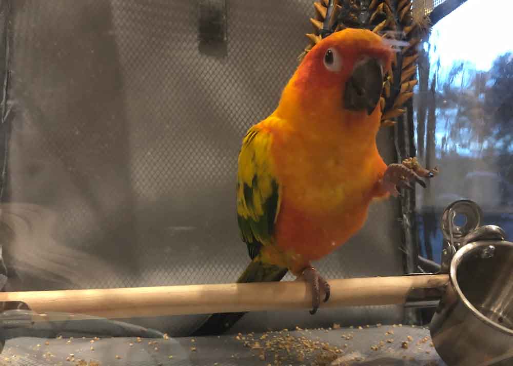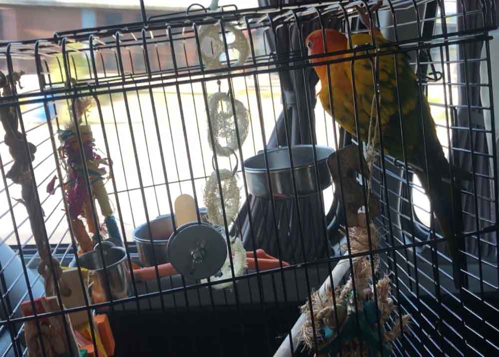 Food bowl with our Birdie Travel Trail Mix or fresh chop that will need to be removed after a couple of hours if not eaten.